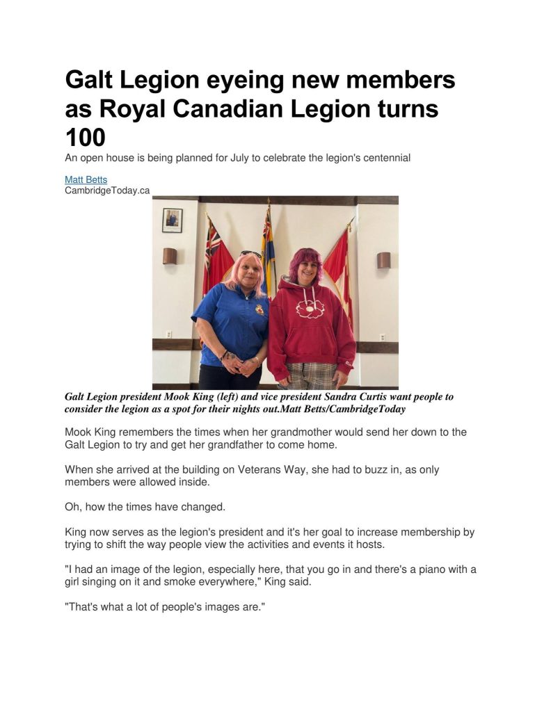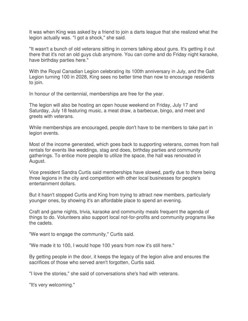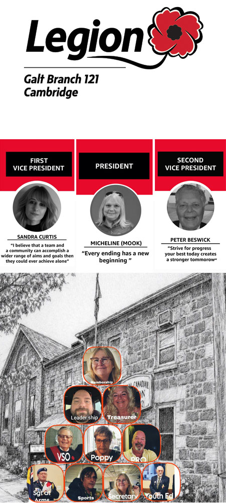 The Galt Royal Canadian Legion is a mainstay of our community, it will celebrate it’s 100th anniversary in 2026 as an organization. The Galt Branch celebrate it’s 100th anniversary in 2028