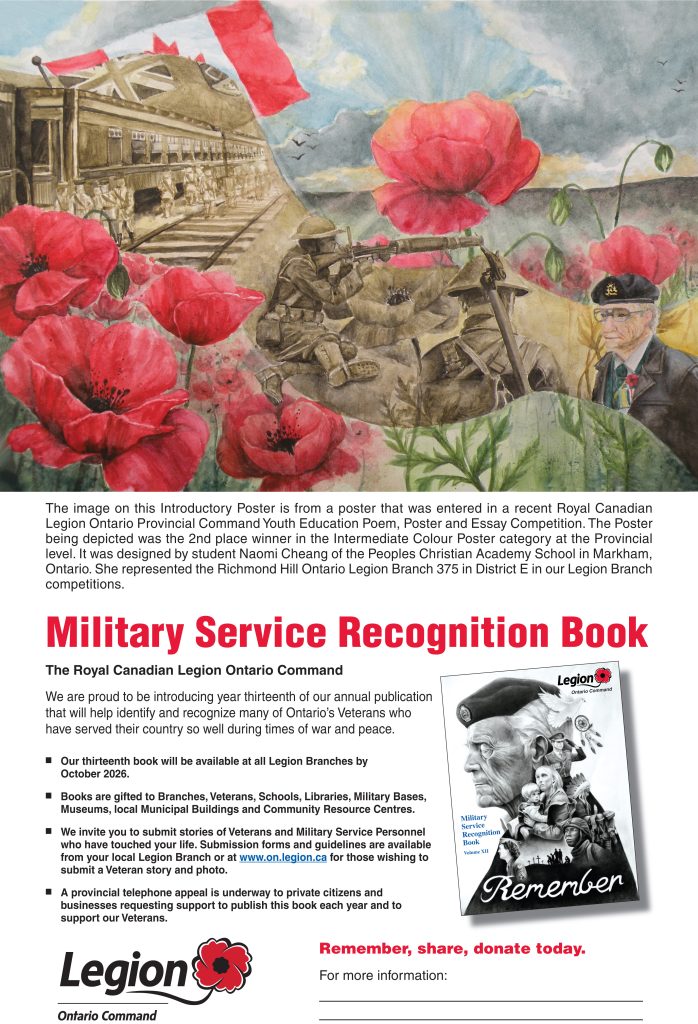 As a leader in honouring military service, Ontario Command proudly publishes its annual Military Service Recognition Book (MSRB), recognizing Veterans who have lived in Ontario and have served – or continue to serve – in the Canadian Armed Forces, as well as Commonwealth or Allied Forces.